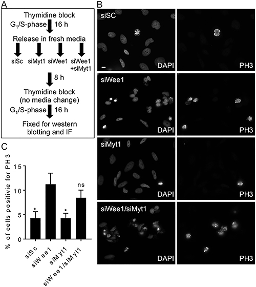Figure 2: siRNA mediated knockdown of Wee1, but not Myt1, induces premature mitosis. HeLa cells synchronized in G1/S phase were transfected with scrambled siRNA (siSc) and siRNAs against Wee1, Myt1, and both Wee1 and Myt1. (A) Experimental flow chart depicting timing and treatments. (B) Cells were fixed 24 h post siRNA transfection and then stained for DNA and PH3. Scale bar = 10 μm. (C) The average percentage of cells positive for PH3 (relative to DNA staining) are graphed. Student t-test was used to determine statistical significance between siWee1 and other treatments (*p < 0.05). Standard error of the mean bars are shown. Experiments were repeated at least three times.