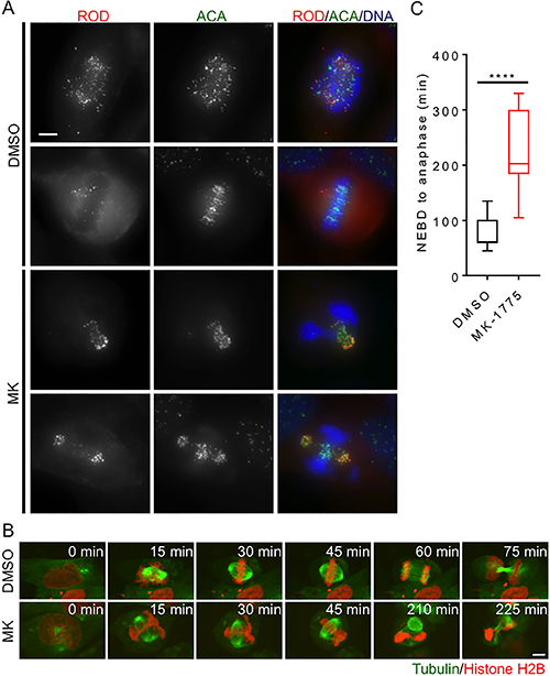 Figure 3: Inhibition of Wee1 induces centromere fragmentation and prolonged mitosis. HeLa cells were synchronized in G1/S phase and then released into media containing either DMSO or MK-1775 (MK). (A) Mitotic cells fixed 4 h post treatment with MK were compared to mitotic cells fixed post treatment with DMSO. Cells were stained for Rough deal (ROD), anti-centromere antibody (ACA), and DNA. Scale bar = 10 μm. (B) HeLa cells stably expressing mCherry-H2B and EGFP-tubulin were treated with DMSO and MK and then analyzed by time-lapse microscopy to determine duration of mitosis (scale bar = 8 μm). Time is counted from NEBD in minutes. MK treated cell (lower panel) is also depicted as cell 12 in Supplementary Figure 4B. (C) The duration of mitosis (NEBD to anaphase) is shown for 8 cells for each treatment. Boxes represent interquartile distributions and whiskers represent 10th and 90th percentiles. Statistical significance was determined by student t-test (****p < 0.0001).