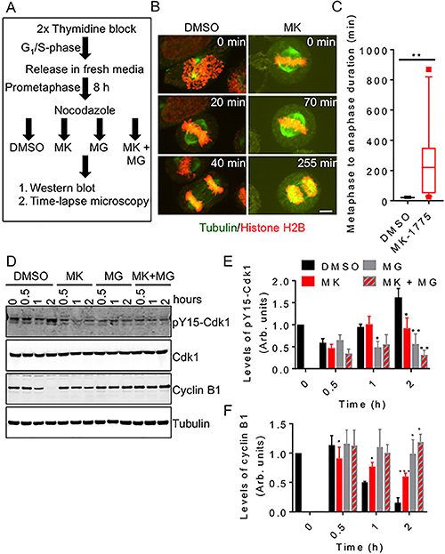 Knowing that Wee1 activity is required for normal mitosis in cells released from G1/S phase, we then asked if Wee1 activity was also required for normal mitosis in cells released from prometaphase. We synchronized HeLa cells (stably transfected with mCherry-H2B and EGFP-tubulin) in prometaphase using nocodazole treatment (Figure 4A). We then released cells from nocodazole treatment into media containing either MK-1775 or DMSO and then measured the time required for cells to complete anaphase (Figure 4B and 4C). We found that the average time required to complete mitosis (metaphase to anaphase) was similar among DMSO treated cells (Figure 4C); however, we found that MK-1775 treated cells arrested at metaphase (Figure 4B, right set of images). During this metaphase arrest, many cells experienced one or more spindle collapses resulting in the temporary loss of chromosome alignment. Overall, we found that the transition from metaphase to anaphase in cells treated with MK-775 took a median time of 220 min with some cells requiring greater than 700 min to initiate anaphase (Figure 4C). In contrast, DMSO treated cells took only 20 min to transition from metaphase to anaphase (student t-test, p = 0.0023). To confirm the delay in mitotic exit, we also released cells synchronized in prometaphase into media containing either MK-1775 or DMSO for up to 2 h and then analyzed the levels of cyclin B1 and phospho-tyrosine 15 Cdk1 (pY15-Cdk1) by western blotting (Figure 4D–4F). We found that MK-1775 treated cells have reduced pY15-Cdk1 and retained 60% of cyclin B1 after 2 h compared to DMSO controls, which had only 15% of cyclin B after 2 h (One-way ANOVA and Dunnett’s multiple comparisons test, p < 0.0005). We also tested if inhibition of proteasome activity with MG-132 [32] could further enhance the effects of MK-1775. Although MG-132 treatment resulted in both higher cyclin B1 and lower pY15-Cdk1 levels compared to DMSO treatment, the differences were not found to be significant (One-way ANOVA and Dunnett’s multiple comparisons test, p = 0.1246). No significant differences were observed between MK-1775 versus the co-treatment with MG-132 (Figure 4E and 4F). We also confirmed that treatment with MK-1775 inhibited Cdk1 phosphorylation and cyclin B1 degradation in U-2 OS, T-47D, and MDA-MB-231 cell lines (Supplementary Figure 5). Together these data confirm that Wee1 activity is required for normal mitotic exit from prometaphase through a Cdk1/cyclin B1-dependent pathway.