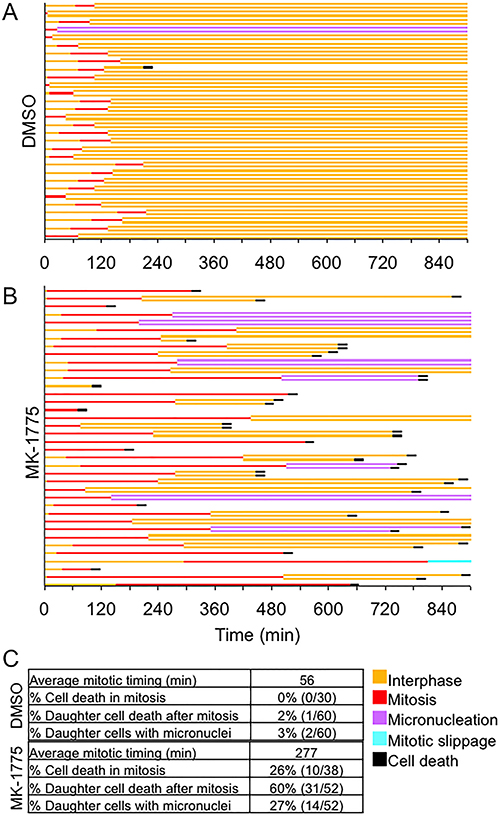 Figure 5: MK-1775 induced mitotic arrest promotes cell death. HeLa cells expressing EGFP-H2B were released from double thymidine block for 9 hours and then treated with either (A) DMSO or (B) MK-1775 for 900 min. A line graph for 38 individual mitotic cells tracked by time-lapse microscopy is shown, which includes times for indicated cellular events. A fork in the line indicates cell division and cell fate of daughter cells is also shown. (C) Table shows the average time spent in mitosis (NEBD to anaphase) and the percentage of cells classified as having indicated features.