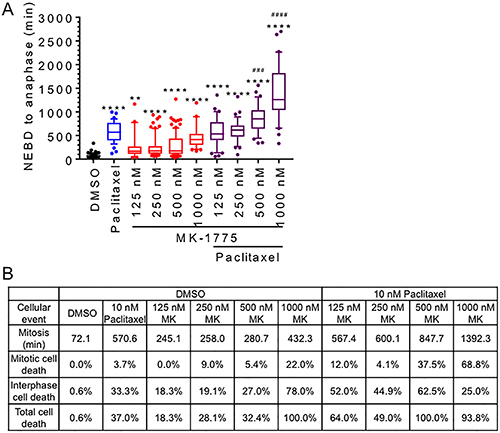Figure 6: MK-1775 induced mitotic arrest is enhanced by co-treatment with paclitaxel. HeLa cells stable expressing GFP-H2B were released from double thymidine block for 9 hours and then treated with DMSO, 10 nM paclitaxel, MK-1775 at indicated concentration alone, or both paclitaxel and MK-1775 for 48 h. (A) Duration of mitosis (NEBD to anaphase) is shown for at least 30 cells for indicated treatments. Boxes represent interquartile distributions and whiskers represent 10th and 90th percentiles. Coloured dots represent statistical outliers. Statistical significance was determined by One-way ANOVA and Tukey’s comparisons test. Asterisk (*) corresponds to significance between DMSO and indicated treatments (**p < 0.005 & ****p < 0.0001), whereas hashtag (#) corresponds to significant increases between co-treatments with paclitaxel and MK-1775 compared to paclitaxel alone (###p < 0.0005 & ####p < 0.0001). Cell fate dendrograms corresponding to DMSO, 500 nM MK-1775, 10 nM paclitaxel, or 500 nM MK-1775 and 10 nM Paclitaxel are included in Supplementary Figure 6. (B) Table shows the average duration of mitosis (NEBD to anaphase) and the percentage of cell death (mitosis or interphase) for indicated treatments.