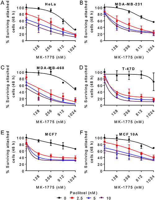 Figure 7: Paclitaxel enhances MK-1775 mediated cell killing in breast cancer cells. (A) HeLa, (B) MDA-MB-231, (C) MDA-MB-468, (D) T-47D, (E) MCF7, and (F) MCF 10A cells were released from G1/S phase for 9 h and then treated with increasing concentration of MK-1775 alone (black curve) or in the presence of 2.5 nM (red curve), 5 nM (blue curve), or 10 nM (purple curve) paclitaxel for 48 h. Average percent surviving attached cells (% Crystal violet OD) is shown. The first point on each curve represents 0 nM MK-1775. Error bars represent standard error of mean (SEM). Statistical significance was determined by Two-way ANOVA (See Table 2).