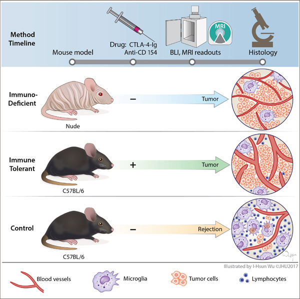 Mouse models are indispensable for the study of disease etiology as well as for the development of new therapies and imaging methods. In oncology, orthotopic xenotransplantation studies are the gold standard for the investigation of human tumor cell biology in vivo [1]. Given the graft vs. host immune incompatibility, xenografting relies on the use of immunocompromised hosts, such as athymic nude mice. While such models can be used to generate clinically relevant data, they do not comprise the full spectra of the patient scenario, in part because they cannot take into account the importance of the role the immune system plays in tumor progression [2]. Moreover, the lack of an adaptive immune system in immunodeficient mice prevents the study of treatments modulating the anti-tumor immune response. While studying tumor biology in the context of active immune surveillance can be accomplished with syngeneic models (mouse to mouse grafts), or through the induction of intrinsic tumors in transgenic mouse strains, it excludes the use of human tumor cells. Here we present an immunocompetent orthotopic xenograft model of glioblastoma (GBM), the most lethal and prevalent primary malignant brain tumor in adults, capable of overcoming these limitations [3]. We found that the transient blockade of T-cell activation during the inoculation phase of intracranial grafts led to the successful engraftment of tumors in immunocompetent mice without further manipulation of the immune system. We demonstrate the resulting xenografts better recapitulate the pathological characteristics of human GBM compared to xenografts grown in classical immunodeficient hosts. T-cell activation was blocked pharmacologically based on strategies developed in the fields of organ transplantation and autoimmunity [4]. T-cell function is dependent on the tightly regulated balance of co-stimulatory and co-inhibitory signals. Activation requires both the T-cell receptor to engage with the antigenic peptide/MHC complex and the co-activating receptor CD28 to bind with its tandem ligand CD80/CD86 (B7.1/B7.2). To avoid over-reactive immune responses, activated T-cells upregulate the high affinity-inhibiting co-receptor, cytotoxic T-lymphocyte-associated protein 4 (CTLA-4, CD152). CTLA-4 competes with CD28 to bind CD80/CD86 leading to suppression of T-cell activation and consequently to anergy [5]. Abatacept (CTLA-4-Ig) is an FDA approved, selective T-cell co-stimulation inhibitor that comprises an extracellular domain of CTLA-4 fused with a fragment of a modified Fc portion of human IgG1. Abatacept binds to CD80/CD86 and prevents it from binding to CD28, leading to the inhibition of the second activating signal and causing the T-cell to become anergic. A second arm of T-cell co-stimulation is mediated through the interaction of the T-cell ligand, CD154, with CD40 on the surface of antigen presenting cells. This interaction results in the upregulation of CD80/CD86, which then increases the potential for T-cell activation [6, 7]. The anti-CD154 antibody clone, MR1, recognizes murine CD154 and prevents its interaction with CD40 to further limit T-cell stimulation [8]. Applying a four-time-point treatment scheme of Abatacept and MR1, we present a highly efficient orthotopic xenotransplantation protocol for implanting human cancer cells into immunocompetent mice (Figure 1). This technology could become extremely useful in pre-clinical drug studies, including those in immune therapy research, and would permit the study of the tumor microenvironment in immunocompetent transgenic rodents.