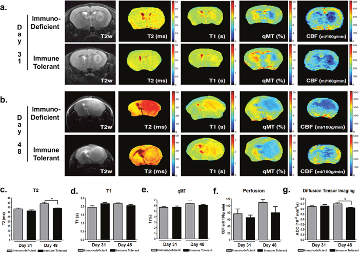 Figure 3: Tumor xenografts in immune tolerant and immunodeficient mice have similar growth characteristics. MRI assessments were performed during the xenografts´ most rapid growth phase at day 31 (a) and day 48 (b) post-inoculation. Similar imaging properties, including quantitative magnetization transfer qMT (c), T2 (d), T1 (e), perfusion (f), and diffusion tensor imaging DTI (g), were detected between both groups. Moderate but statistically significant differences were observed with T2 and DTI at day 48. p<0.05.