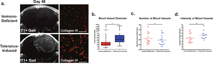 Figure 4: Immune tolerant mice have increased blood-brain-barrier permeability and differences in vascular features. Tumor xenografts in immune tolerant mice resulted in stronger and more heterogeneous contrast enhancement on gadolinium-enhanced T1-weighted imaging compared to immunodeficient controls. Stronger contrast enhancement suggested increased blood-brain-barrier permeability/leakage in immune tolerant mice (a). Quantification of histological assessments of the tumor grafts for Collagen IV revealed higher vascularization in transplants grown in mice with intact immune systems, as evidenced by increased blood vessel diameters (b). No differences in blood vessel numbers (c) or blood vessel staining intensity (d) was observed. Scale bars 50uM, p<0.01.