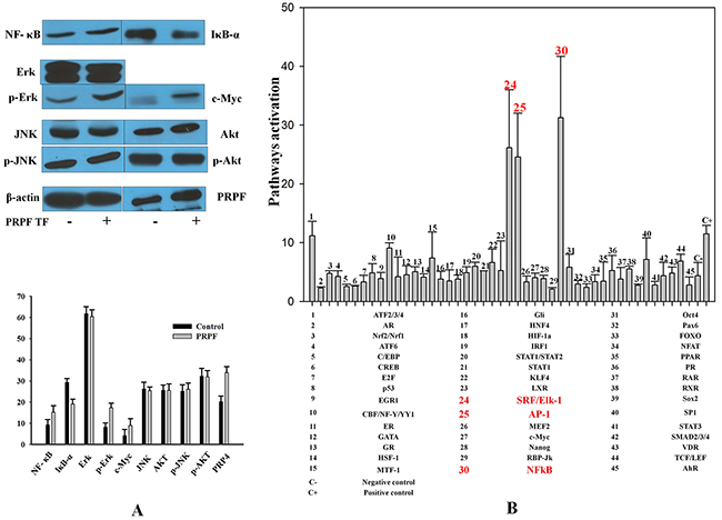 Figure 2: Resveratrol-induced cell death is inhibited by PRPF through activation of cell survival pathways. (A) Western blotting of untransfected and PRPF-transfected HCT116 cell lysates to assess NFκB, IκBα, AKT, and c-MYC levels. Actin is used as a loading control. (B) Cignal 45-Pathway Reporter Array data in HCT116 cells upon PRPF overexpression. The experiment was performed in triplicate, and data represent the means ± SD.