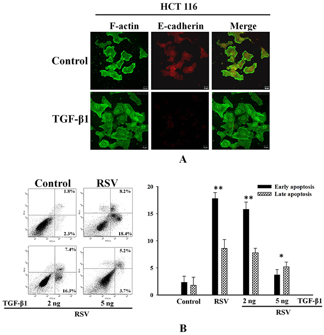 Figure 6: TGF-β1 inhibits resveratrol-induced apoptosis through the induction of EMT in HCT116 cells. (A) HCT116 cells pretreated with 2 or 5 ng of TGF-β1, and incubated with RSV. Cells are double-stained for F-actin and E-cadherin and analyzed by confocal microscopy. (B) Inhibitory effect of TGF-β1 against resveratrol-induced apoptosis using an annexin-V/PI apoptosis assay. Data represent the means ± SD. *P < 0.05; ***P < 0.01.