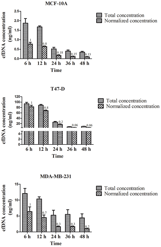 Figure 1: CfDNA concentration in the supernatant of MCF-10A, T47-D, and MDA-MB-231 cell lines under normal culture conditions. The number at the top of each bar represents the relative concentration at each time point. Total concentration: the cfDNA concentration in the supernatant of breast cancer cells. Normalized concentration: the cfDNA concentration was normalized in terms of the amount of viable cells.