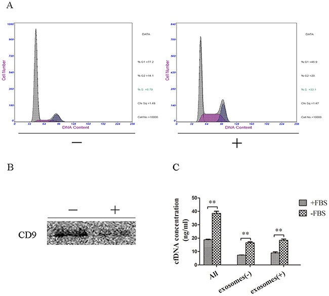 Figure 4: CfDNA concentration of exosomes and the corresponding culture supernatant. (A) Cell-cycle analysis of cells cultured with or without FBS; (B) CD9 expression of exosomes extracted from the supernatant with or without FBS; (C) CfDNA concentration of total supernatant (all), exosomes (exosomes (+)) and supernatant without exosomes (exosomes (-)). +: culture with FBS; —: culture without FBS.