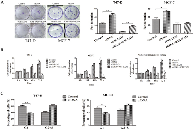To explore the biological significance of cfDNA in breast cancer cells, T47-D and MDA-MB-231 were treated with cfDNA extracted from the supernatant of MD-MB-231 breast cancer cells. Clone formation assays and CCK-8 proliferation assays showed that cfDNA could not promote the proliferation of MDA-MB-231 cells (Supplementary Figure 3). In contrast, the clone formation assay showed that the number of foci formed by T47-D cells increased significantly after cfDNA was added into medium compared with the control group (mean foci number: 46 vs. 24, p < 0.01). When T47-D cells were treated with 4-hydroxy-tamoxifen (4OH-TAM), the number of foci decreased significantly; however, the cfDNA plus 4OH-TAM group had more foci than the 4OH-TAM group (18 vs. 5, p < 0.05) (Figure 5A). The results of the CCK-8 proliferation assay were consistent with those of the clone formation assay. In addition, the proliferative ability of T47-D cells in anchorage-independent culture conditions also was assessed and the results were similar to those in anchorage-dependent conditions (Figure 5B). Cell-cycle analysis showed that the number of T47-D cells in the G1 phase declined significantly when they were incubated with cfDNA (p < 0.01) (Figure 5C). Similarly, we found that cfDNA could promote the proliferation of MCF-7 cells (p < 0.05) (Figure 5).