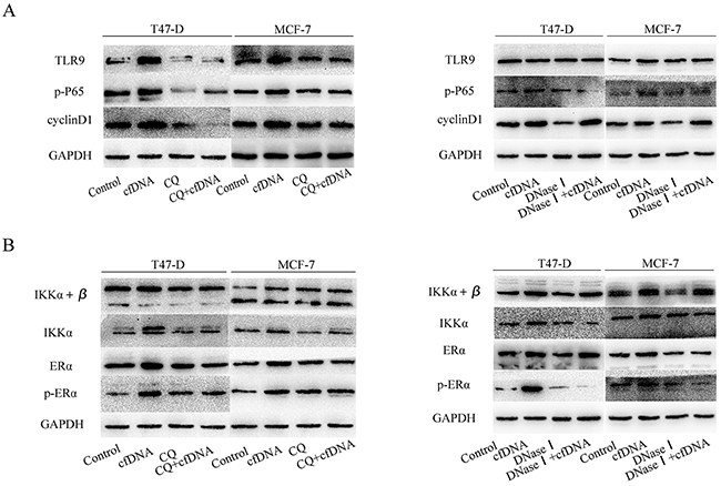 Figure 6: Protein expression levels of TLR9-NF-κB pathway members after the cells were treated with cfDNA. (A) Protein expression levels of TLR9, p-P65, and cyclin D1 in T47-D and MCF-7 cells after treatment with cfDNA, CQ, cfDNA+CQ, DNase I, DNaseI+cfDNA; (B) protein expression levels of IKK α + β, IKK α, ERα, and p- ERα in T47-D and MCF-7 cells after treated with cfDNA, CQ, cfDNA+CQ, DNase I, DNase I+cfDNA. CQ: chloroquine; p-P65: phosphorylated P65; p-ERα; phosphorylated Erα.