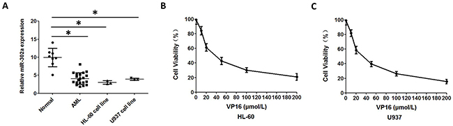 Figure 1: Reduced expression of miR 302a in AML patients and AML cell lines. (A) qRT-PCR analysis of miR-302a expression in MNCs from healthy people, AML patients and AML cell lines. (B) the proliferation of HL-60 treated with different concentration of VP16 measured by CCK8. (C) the proliferation of U937 treated with different concentration of VP16 measured by CCK8. Each result represents the mean of three independent experiments.* P<0.05, ** P<0.01.