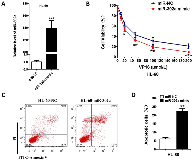 Figure 2: Overexpression of miR-302a enhances the sensitivity to VP-16 in HL-60 Cell. (A) HL-60 was transfected the miR-302a or negative control by Lipo2000. the expression level of miR-302a was measured by qRT-PCR. (B) compare to negative control, overexpression of miR-302a enhance the sensitivity to VP16 measured by MTT in HL-60. (C,D) cells were stained with PI and FITC-Annexin V, the percentage of apoptosis cell measured by flow cytometry. Each result represents the mean of three independent experiments.* P<0.05, ** P<0.01. *** P<0.001.