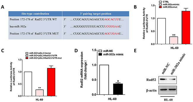 Figure 3: Rad52 is a direct target of miR-302a. (A) Schematic representation of Rad52 3′-UTRs showing putative miR-302a target site. (B) the relative luciferase activity of miR-302a mimics or mutant with pGL3-Rad52 constructs in HL-60 cell lines. (C) the relative luciferase activity of Rad52 indicated constructs in HL-60 cell lines. (D) qRT-PCR was performed to detect the expression of Rad52 in HL-60 transfected with miR-302a mimics or negative control. (E) Western blot analysis of Rad52 expression in HL-60 cells transfected with negative control or miR-302. Each bar represents the mean of three independent experiments.* P<0.05, ** P<0.01.