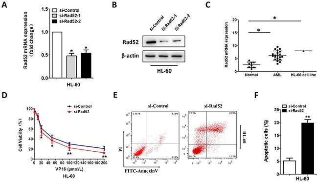 Figure 4: Downregulation of Rad52 increased VP-16 sensitivity of the HL-60 cell. (A,B) downregulation of Rad52 in HL-60 transfected with Rad52 siRNA, control sequence served as loading control. qRT-PCR and Western blot were conducted to measure the Rad52 expression level. β-actin served as loading control. (C) qRT-PCR analysis of Rad52 mRNA expression in MNCs from healthy people, AML patients and AML cell line HL-60. (D) downregulation of Rad52 enhance the sensitivity to VP16 in HL-60 cell. (E,F) HL-60 cells were stained with PI and FITC-Annexin V, the percentage of apoptosis cell measured by flow cytometry. Each result represents the mean of three independent experiments.* P<0.05, ** P<0.01.