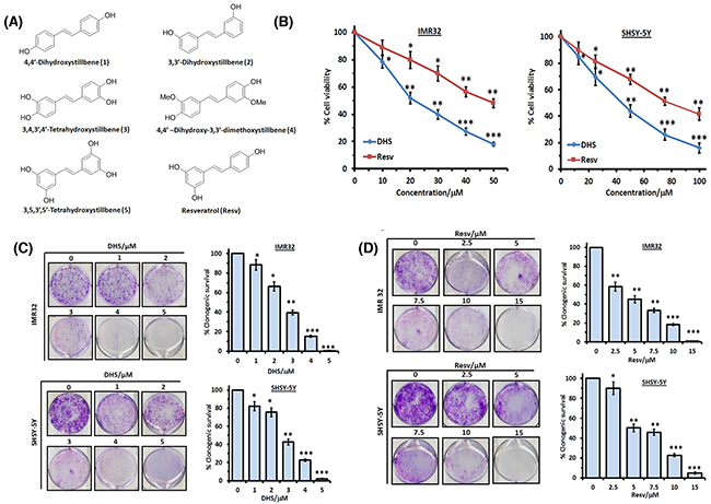 Although various hydroxystilbenes have shown encouraging anti-cancer property in pre-clinical/clinical studies, we disclose for the first time that amongst the tested hydroxystilbenes, DHS(compound 1) was most effective, and showed better cytotoxic activity to both the neuroblastoma cell lines than Resv as reflected from the MTT and clonogenic assay results (Figures 1B–1D).