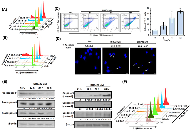 Figure 2: DHS induces caspase-9/caspase-3-mediated apoptosis in IMR32 cells. (A) and (B) Sub-G1 population analyses. The cells were incubated with different concentrations of DHS (A) or Resv (B) for 48 h, and the sub-G1 populations analyzed by flow cytometry. (C) Annexin V/PI assay. The cells were incubated with DHS (20 μM) for 0-12 h, co-stained with PI and Annexin-V FITC and analyzed by flow cytometry. (D) Nuclear chromatin condensation. The cells were incubated with DHS (0, 20 and 40 μM) for 48 h, stained with Hoechst 33342, and observed under an Axioskop II Mot plus (Zeiss) microscope (40 × optics). The scale bar represents 10 μm, while white arrows indicate fragmented and condensed nuclei. (E) Expressions of the caspases. The caspases expressions in the whole cell extracts of the cells, incubated with DHS (0 and 20 μM) for different time-points were assessed by immunoblots. The protein bands were detected using a Kodak Gel-doc software and the intensity ratios of the individual bands to that of vehicle control, taken as 1 (arbitrary unit) were quantified after normalizing with respective loading controls. (F) Effect of the caspases inhibitors on apoptosis induction. The cells were treated with vehicle (0.1% DMSO) or pan-caspase or caspase-9/caspase-8/caspase-3-specific inhibitors (10 μM) for 1 h followed by incubation with DHS (20 μM) for 48 h, and the sub-G1 cell populations analyzed by flow cytometry. All determinations were made in duplicates for immunoblots and microscopy, and five replicates in flow cytometry analyses in 3-4 different experiments. The values are mean ± S. E. M. *p<0.05, **p<0.01 compared to vehicle control; $p<0.05, #p<0.01 compared to only DHS treatment. Representative dot plots, histograms and images are shown.