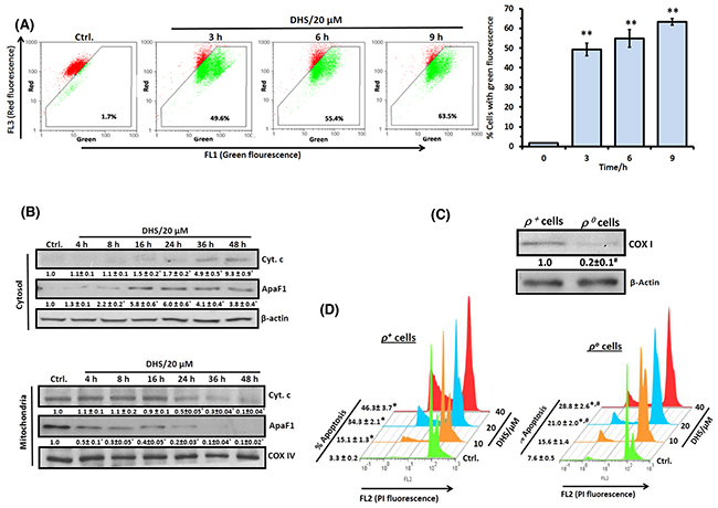 Figure 3: DHS permeabilizes mitochondrial membrane of IMR32 cells to induce apoptosis. (A) Flow cytometry analyses of ΔΨm. The cells were incubated for different periods with DHS (0 and 20 μM), stained with JC-1 for 15 min, and ΔΨm loss quantified by flow cytometry from the increased green fluorescense. (B) ApaF1and cyt. c translocation. The cytoplasmic and mitochondrial cell extracts were respectively subjected to immunoblotting, using suitable antibodies against ApaF1 and cytochrome c. (C) Mitochondria depletion in cells. The IMR32-ρo cells were prepared and the mitochondrial DNA deficiency was assessed from the COX I expressions in the ρ+ and ρo cells. The protein bands in the immunoblots were detected using a Kodak Gel-doc software and the intensity ratios of the individual bands to that of IMR32-ρo control, taken as 1 (arbitrary unit) were quantified after normalizing with respective loading controls. (D) Increased sensitivity of the IMR32-ρo cells to DHS treatment. The ρ+ and ρo cells were incubated with different concentrations of DHS (0-40 μM) for 48 h, and the sub-G1 cell populations analyzed by flow cytometry. All determinations were made in duplicates for immunoblots and five replicates for flow cytometry analyses in 3-4 different experiments. The values are mean ± S. E. M. *p<0.05, **p<0.01 compared to respective vehicle controls; #p<0.01 compared to ρ+ cells. Representative dot plots, histograms and images are shown.