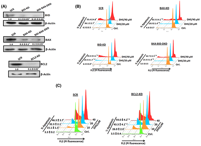 To probe the roles of BAX, BCL2 and BID in the DHS-mediated apoptosis, we generated IMR32 cells, depleted with BAX (70% depletion), BID (90% depletion), BAX-BID together (~85% depletion) and BCL2 (90% depletion) (Figure 6A). The cells transfected with siRNA/shRNA, possessing scrambled sequence served as the respective SCR controls. The gene-specific siRNA/shRNA transfected cells were named as BAX-KD (BAX-knock down), BID-KD (BID-knock down), BAX-BID-DKD (BAX-BID-double knock down) respectively. Next, we assessed the response of all these cells to DHS treatment. Our results showed that DHS treatment (20 μM, 48 h) induced ~30, 13, 14 and 9% apoptotic sub-G1 population in SCR, BAX-KD, BID-KD and BAX-BID-DKD cells respectively (Figure 6B). A similar effect was also observed with DHS (40 μM). On the other hand, the BCL2-KD cells were more sensitive to DHS (20 μM) than the SCR cells, showing increased sub-G1 population at 48 h (~29% in SCR vs 40% in BCL2-KD, Figure 6C). Similar effects were also observed with DHS (10 and 40 μM).