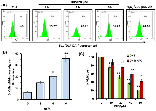 Figure 7: Intracellular ROS is involved in the DHS-induced cytotoxicity in IMR32 cells. (A) and (B) ROS generation by DHS as revealed by flow cytometry. Cells were treated with DHS (0 and 20 μM) for different time periods and the ROS levels measured by the H2DCF-DA assay. (C) Effect of NAC on cell viability after DHS treatment. The cells were pretreated with NAC (5 mM) or sham medium for 1 h, further incubated for 48 h with DHS and the cell viability assayed by MTT reduction method. All determinations were made in five replicates in 3-4 different experiments. The values are mean ± S. E. M. *p<0.05, **p<0.01 compared to vehicle control; $p<0.05 compared to only DHS treatment. Representative histograms are shown.