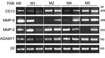 Figure 1: PCR analyses of CD13, MMP-9, MMP-2 and ADAM17 transcripts in primary AML cells. Samples were standardized for total cDNA content by assessing the presence of identical amounts of β2-microglobulin transcripts. PCR products were run on 1.8% agarose gels.