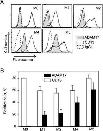 Figure 2: Levels of surface CD13 and ADAM17 expression in primary AML cells. (A) Representative histograms of M0-, M1-, M2-, M4- and M5-subtype primary AML cells stained with anti-CD13-PE and anti-ADAM17-PE and then examined by flow cytometry analysis. Staining of cells with their isotype IgG1-PE served as the negative control (broken line). (B) Results of the percentage of surface CD13 and ADAM17 expression on AML blast samples (1 M0, 18 M1, 12 M2, 12 M4, 9 M5). Values are expressed as means ± SEM.