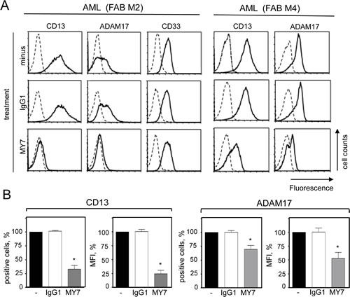 Figure 4: Effect of the anti-CD13 MY7 on surface CD13 and ADAM17 expression in primary AML cells. Cells were cultured for 24 h in the presence of absence of mIgG1 or MY7 (10 µg/ml). (A) Cells were stained with anti-CD13-PE, anti-ADAM17-PE, anti-CD33-FITC or their isotypes (-PE, -FITC) and then examined by flow cytometry. (B) Results of the percentage of CD13- and ADAM17-positive AML cells and of MFI. Values are expressed as means ± SEM (n = 15, all FAB subtypes considered). *P <0,0001 vs IgG1-treated cells.