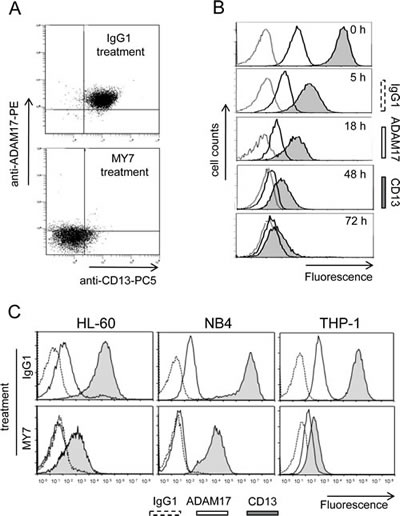 Figure 5: MY7-mediated downregulation of CD13 and ADAM17 in AML cell lines. (A) U937 cells were cultured for 48 h in the presence of absence of mIgG1 or MY7 (10 µg/ml). Cells were stained with mIgG1-PC5/mIgG1-PE or anti-CD13-PC5/anti-ADAM17-PE and then examined by flow cytometry. Quadrants delineated by squares indicate negative and positive populations of cells as determined using negative control (mIgG1-PC5/mIgG1-PE). (B) Cells were cultured in the presence of absence of mIgG1 or MY7 (10 µg/ml) for 5, 18, 48 and 72 h. Time-response histograms showing specific fluorescence intensities of CD13 and ADAM17 of MY7-treated cells as determined by flow cytometry. (C) AML cell lines HL-60, NB4 and THP-1 were treated with mIgG1 or MY7 (10 µg/ml) for 18 h. Cells were stained with anti-CD13 MY7-PE, anti-ADAM17-PE or mIgG1-PE (negative control) and analyzed for surface CD13 and ADAM17 expression. Representative experiments are shown.