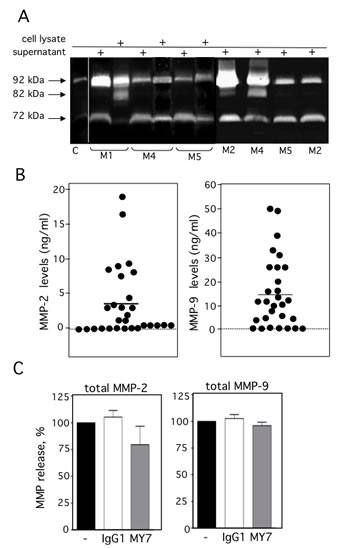 Figure 3: Expression of proMMP-2 and proMMP-9 in AML cells. (A) The gelatinolytic activities of MMP-2 and MMP-9 were analyzed using zymography, in the 48 h-conditioned media (supernatant) and/or in whole cell lysates from 7 patients with AML. Control (C) FCS-supplemented culture medium alone incubated under the same conditions. (B) Total MMP-2 (first column) and total MMP-9 (second column) productions in the 48 h-culture supernatants from 29 AML samples were determined by ELISA. Mean concentrations are indicated by a horizontal line. Control included FCS-supplemented culture medium alone incubated under the same conditions. (C) AML cells were cultured for 48 h in the presence of absence of IgG1 or MY7 (10 µg/ml). Total MMP-2 and MMP-9 production measured by ELISA. Data represent the mean of six AML samples. Values are expressed as means ± SEM.