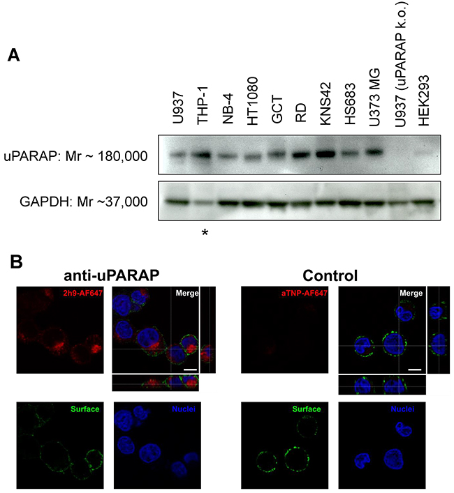 Figure 1: Expression of uPARAP by different cancer cell lines and specific cellular uptake of fluorescence-labeled mAb 2h9. (A), whole cell lysates of the cancer cell lines U937, THP-1, NB-4, HT1080, GCT, RD, KNS42, HS683 and U373 MG were examined for expression of uPARAP by Western blot, together with lysates of uPARAP-deficient U937 cells obtained by CRISPR/Cas9 technology (“U937 uPARAP k.o.”; see Methods) and non-malignant HEK293 cells. uPARAP was detected using anti-uPARAP mAb 2h9 as the primary antibody. Bands of apparent Mr 180,000 confirm expression of uPARAP in all of the cancer cell lines except for U937 uPARAP k.o. Negligible expression of uPARAP is observed in HEK293 cells. An antibody against GAPDH (Mr 37,000) was used as a loading control. Asterisk: The THP-1 cell line displayed a reduced GAPDH signal, although identical loading of total protein was used; see Methods. (B), demonstration of cellular uptake of AlexaFluor 647-conjugated mAb 2h9. U937 cells were incubated with fluorescently labeled uPARAP-directed mAb 2h9 (left) or control mAb aTNP (right), after which the intracellular fluorescence was examined by confocal microscopy. Blue: nuclear (Hoechst) stain; green: plasma membrane (anti-hCD45-AlexaFluor 488) stain; red: AlexaFluor 647-labeled mAbs. z-stack images verify intracellular, vesicular localization of AlexaFluor 647-labeled antibody only in cells incubated with labeled mAb 2h9. Scale bar: 5 μm.