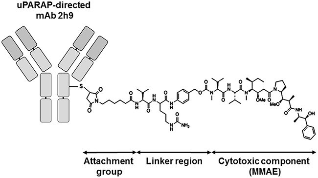 Figure 2: Schematic view of the uPARAP-directed ADC showing the structural constituents of a mAb-vc-MMAE ADC. Attachment group: A thiol-directed maleimidocaproyl group. Linker region: valine-citrulline-p-aminobenzoyloxycarbonyl, “vc”. Cytotoxic component: monomethyl auristatin E (MMAE), a potent tubulin inhibitor. The DAR is readily adjustable (see Methods), and a maximal DAR of 10 can be obtained with a murine IgG1 using the employed protocol.