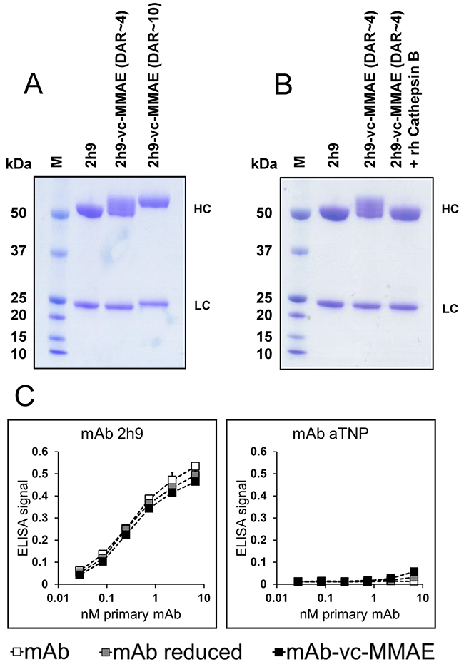Batches of 2h9-vc-MMAE with moderate (~4) or high (~10) DAR were analyzed by reducing SDS-PAGE and compared with unmodified mAb 2h9. As shown in Figure 3A, the ADCs have decreased gel mobility relative to the unmodified mAbs and this effect becomes more pronounced at a high DAR. The ADC with a moderate DAR appeared to be mainly conjugated via heavy chain cysteines, evident from the lack of mobility shift of the IgG light chain in the DAR~4 batch. In contrast, the ADC with a high DAR of 10 appeared to be conjugated via both heavy and light chains. To study the sensitivity of the conjugate to proteolytic release of the toxin, we incubated a sample of 2h9-vc-MMAE (DAR~4) with recombinant cathepsin B. This led to a reversion of the electrophoretic mobility back to that of unconjugated mAb, indicative of valine-citrulline dependent linker cleavage by the lysosomal protease (Figure 3B).