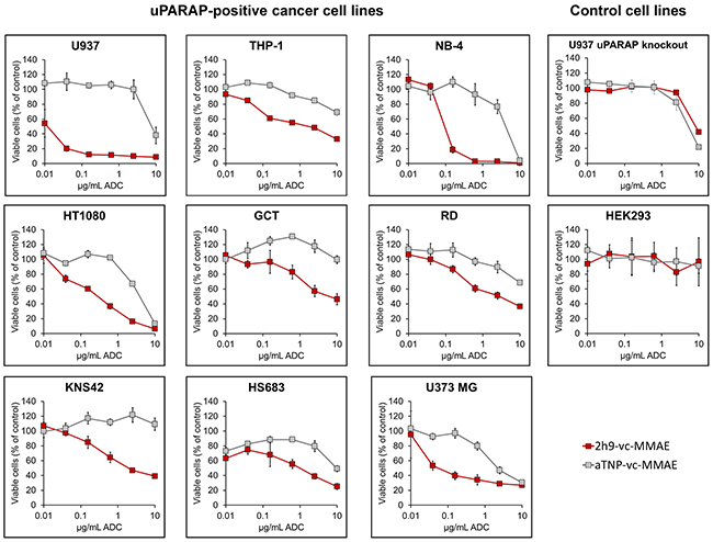 Figure 4: Effect of uPARAP-directed ADC 2h9-vc-MMAE on uPARAP-positive cancer cells in vitro. MTS-based cell viability assays. Curves display the concentration dependent reduction in cell population viability obtained with uPARAP-directed ADC 2h9-vc-MMAE (red) versus control ADC aTNP-vc-MMAE (grey) in uPARAP-positive U937, THP-1, NB-4, HT1080, GCT, RD, KNS42, HS683 and U373 MG cells, as well as in U937 uPARAP knockout cells and HEK293 cells. Viability is shown as percentage of viable cells, normalized to an untreated control population.