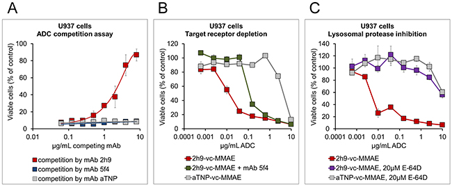 Altogether, these experiments showed that the cytotoxic effect of 2h9-vc-MMAE is dependent on the interaction between the targeting antibody and the target receptor, as well as lysosomal cleavage of the valine-citrulline-containing ADC linker.