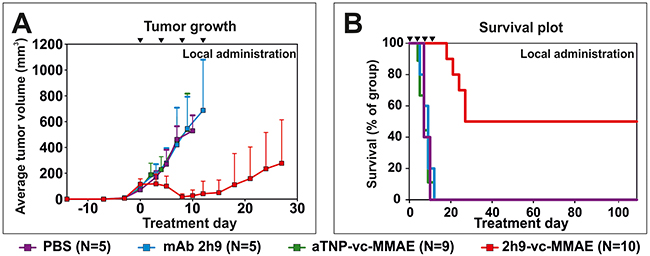 Studies on treatment of subcutaneous tumors were performed with either local (subcutaneous) or systemic (intravenous) administration of reagents. For the study on local administration, upon formation of palpable tumors with a volume of ~50-100 mm3, mice were randomized into four treatment groups, receiving either 2h9-vc-MMAE (N=10), aTNP-vc-MMAE (N=9; one mouse in a group of 10 failed to develop palpable tumors), unmodified mAb 2h9 (N=5) or PBS vehicle control (N=5). All treatments were given as a total of four subcutaneous doses of 3 mg/kg mAb component near the tumor, with one dose every four days (q4dx4 schedule). Injections were performed under brief isoflurane anesthesia. During treatment, the tumors were measured every second day, until reaching a point of sacrifice (euthanasia due to tumor burden). Mice which completely lost any tumor burden were then examined twice a week for a period of 3 months after the final injection.