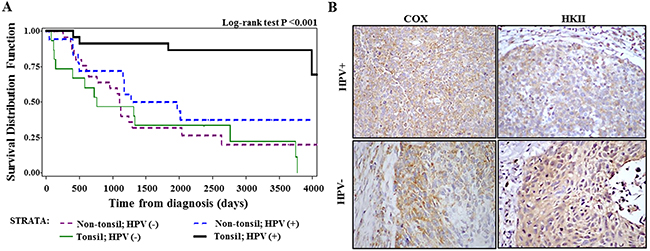Figure 3: Analysis of tissue samples from patients with HNSCC. (A) Overall survival of oropharyngeal cancer patients stratified by tonsil location and HPV status. (B) Immunohistochemical analysis of cytochrome c oxidase (COX) subunit 1 and hexokinase II (HKII) in HPV-positive and HPV-negative tissues samples from patients with oropharyngeal cancer (x400 magnification).