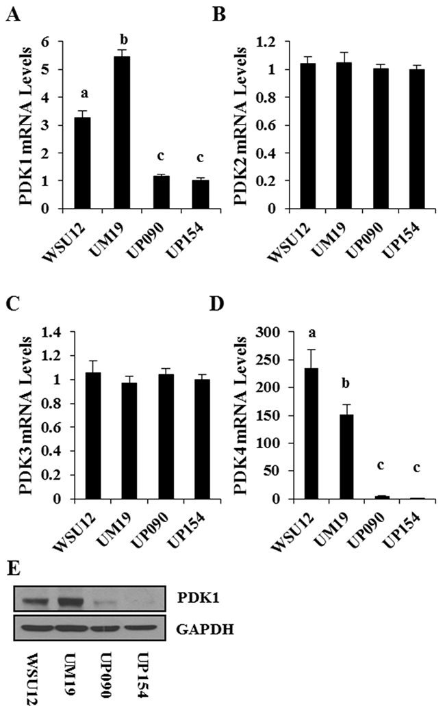 Figure 4: PDK expression profile in HNSCC cell lines. Quantitative RT-PCR of PDK1 (A), PDK2 (B), PDK3 (C), and PDK4 (D). Each bar represents the mean ± S.D. Means with different letters (a, b, c) are significantly different from one another at P value < 0.05 (ANOVA followed by Newman-Keuls test). (E) Immunoblot analysis of PDK1.