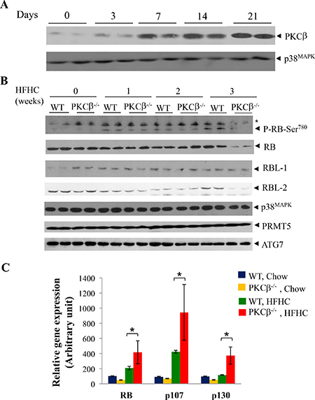 Figure 1: HFHC diet intake reduces RB protein content post-transcriptionally in PKCβ-/- liver compared to normal WT liver. (A) Eight-week-old WT and PKCβ-/- mice (n = 4) were fed an HFHC diet for indicated periods and expression levels of PKCβ isoform in the pooled liver extracts (2 livers per lane) were determined by immunoblotting. (B) Comparison of phospho-RB, RB, p107, and p130 levels in the livers of WT and PKCβ-/- mice fed an HFHC diet for the indicated periods. Equal amounts of protein were loaded per well and immunoblots were probed with antibody specific for PKCβ, RB, p107, p130, P-RB (Ser780), ATG7, PRMT5, and p38MAPK. (C) Q-RT-PCR analysis comparing relative mRNAs of RB, p107, and p130 in the pooled liver extracts of the above mice (16). Individual RNAs from the above livers were run in triplicate, and average values were calculated. Results are expressed as the mean ± SD. *, <0.05. The experiment was repeated twice with similar outcomes.