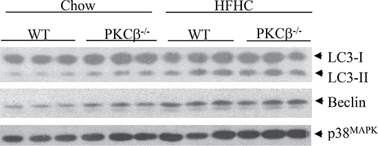 Figure 4: Comparison of hepatic autophagy levels between genotypes. WT and PKCβ-/- mice (n = 3) fed an HFHC diet for two weeks were sacrificed, and liver protein extracts were analyzed for the levels of autophagy markers. LC3-II accumulation was quantified by LC3-II/LC3-I ratio.