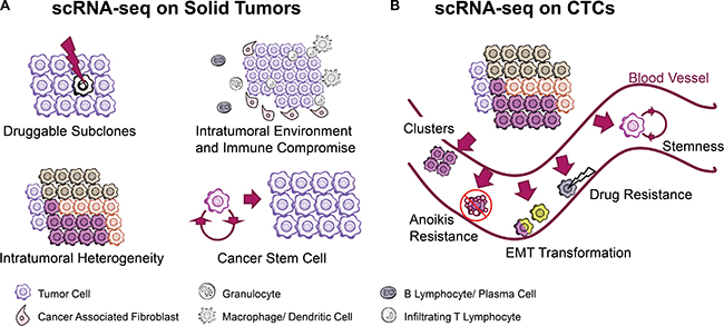 The diverse applications of scRNA-seq include embryogenesis and stem cell differentiation, organ development, immunity, whole-tissue subtyping, neurobiology and tumor biology. Notably, cancer research is becoming even more intriguing, as intratumoral heterogeneity and the tumor microenvironment can now be studied with scRNA-seq. Solid tumors, cell lines, and circulating tumor cells (CTCs) are hot topics in the single-tumor cell research arena, showing a powerful capacity to reveal transcriptomic heterogeneity, signaling pathways related to drug resistance, immune tolerance and intratumoral heterogeneity. In this review, we mainly discuss the significant progresses in the scRNA-seq and its applications in cancer research.