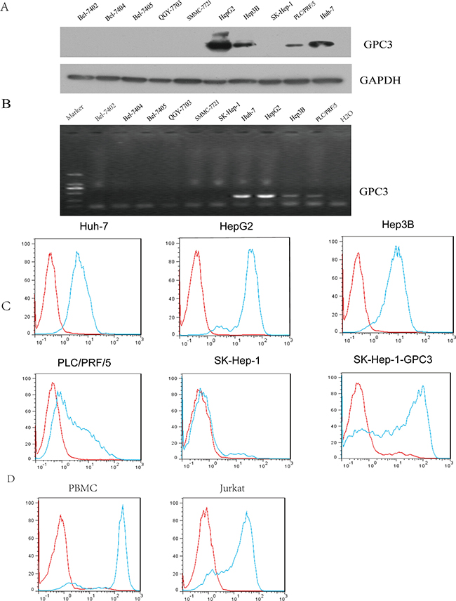 Figure 2: Detection of surface GPC3 expression. Surface GPC3 expression in various HCC cell lines was analyzed by western blot analysis (A) and RT-PCR (B). We also confirmed the GPC3/CD3 BiTE binding potency with these HCC target cells using flow cytometry; the antibody (green) and isotype antibody control (red) are shown in (C) Additionally, the binding with effector cells of GPC3/CD3 BiTE is shown; the effector cells were PBMCs and Jurkat cells, which both express CD3.