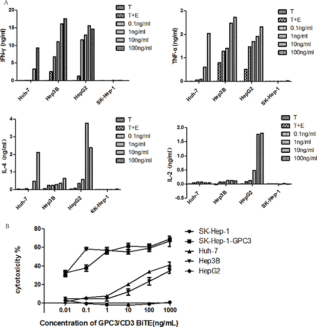 Figure 3: Cytokines released by GPC3/CD3 BiTE-redirected T cells and their cytotoxicity. (A) Cytokines released after GPC3/CD3 BiTE-redirected T cell lysis in various cocultured HCC cell lines for 40 h; the E: T ratio was 10:1, and the experiments were performed in triplicate. The target cells were Huh-7, Hep3B, HepG2 and SK-Hep-1 cultured with or without the GPC3/CD3 BiTE. (B) In vitro cytotoxicity of the GPC3/CD3 BiTE redirected T cells. The target cells were Huh-7, Hep3B, HepG2 and SK-Hep-1 and SK-Hep-1 GPC3.