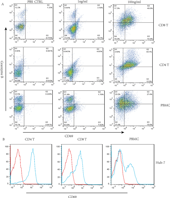 Figure 4: Granzyme B expression when GPC3/CD3 BiTE redirected lysis to HCC in the presence of CD4+ and CD8+ T cells. (A) Three-color flow cytometry analysis of granzyme B, PBMCs, CD4+ and CD8+ T cells separately cocultured with Huh-7 cells in the presence of GPC3/CD3 BiTE. (B) We also detected the expression of the activation marker CD69 in permeabilized CD4+ and CD8+ T lymphocytes in response to incubation with 100 ng/mL of GPC3/CD3 BiTE for 16 h.