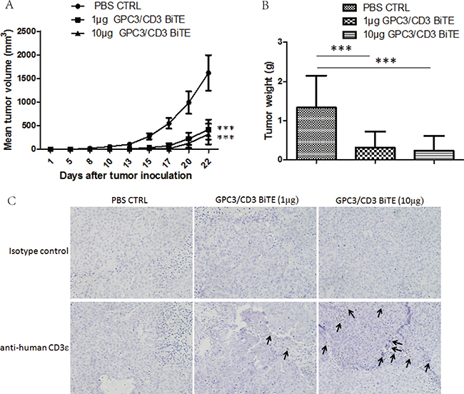 Figure 5: In vivo efficacy of GPC3/CD3 BiTE in Huh-7 subcutaneous xenograft models. Cohorts of six NOD/SCID mice were used. (A) and (B) Mice were subcutaneously inoculated with 2 × 106 Huh-7 human HCC cells in the absence or presence of 4 × 106 unstimulated human PBMCs from healthy donors (E:T = 2:1). Animals were either treated through tail vein injection with a PBS vehicle control or with 1 μg or 10 μg GPC3/CD3 BiTE per mouse per day. The mean values of the tumor growth curves are shown for mice treated with the PBS vehicle control in the absence or presence of human PBMC. For Huh-7 treated animals, individual tumor growth curves are shown. (B) Tumor weights were measured when the mice were sacrificed. (***P < 0.001). (C) The infiltration of T cells in Huh-7 xenograft tumors. Tumors were collected from mice bearing Huh-7 subcutaneous xenografts treated with PBS, 1 μg GPC3/CD3 BiTE or 10 μg GPC3/CD3 BiTE. Formalin-fixed, paraffin-embedded tumor sections were consecutively cut and stained for human CD3 expression (brown). The images were taken with the microscope (BX41, Olympus, PA) and camera (DP70) under ×200 magnifications.