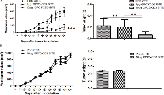 Figure 6: In vivo efficacy of GPC3/CD3 BiTE in SK-Hep-1 GPC3 and SK-Hep-1 xenograft models. There were six mice in each group. A total of 2 × 106 SK-Hep-1 GPC3 (A) or SK-Hep-1 (B) cells and 4 × 106 unstimulated human PBMCs were inoculated into the mice. Then, 10 μg or 1 μg of the GPC3/CD3 BiTE or PBS (control) was infused via the tail vein for 5 continuous days. On day 36, the tumors in the 10 μg group were smaller than those in the control group in the SK-Hep-1 GPC3 model (A). In the SK-Hep-1 model (B), there was no difference between the two groups. (***P < 0.001, **P < 0.05)