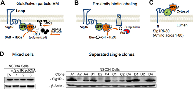 Figure 1: Diagrams of the APEX2 strategy for Sig1R localization and generation of the Sig1R knockout NSC34 cell line with CRISPR-Cas9. (A) Diagram of APEX2-enhanced gold particle EM. APEX2 is fused to the C-terminus of Sig1R-GFP and expressed in NSC34 cells. In the presence of H2O2, APEX2 catalyzes polymerization of DAB which reacts with osmium to produce precipitates that increase EM contrast, or reacts with silver nitrate and gold chloride resulting in easily visualized larger electron-dense aggregates or particles. The Sig1R topology is drawn based on the conventional two-transmembrane model [1]. (B) Diagram of APEX2-catalyzed proximity biotin labeling. APEX2 converts biotin-phenol into oxidative radicals which covalently inserts into proteins in close proximity (protein x). Biotinylated proteins can be visualized by fluorescently labeled streptavidin revealing Sig1R localization. (C) Diagram showing GFP-APEX2 fused to the C-terminus of Sig1RN80 (amino acids 1-80), which is proposed to be on the cytosolic side of the ER membrane [1, 3]. (D) Identification of effective Sig1R sgRNAs and selection of Sig1R KO NSC34 cell single clones. Cas9-positive cells were enriched with 1 μg/ml puromycin for 7 days. Cells expressing sgRNA No.1 were serially diluted and expanded for single clone selection. EV: empty vector.