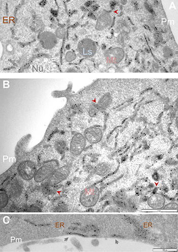 Using this method, we observed Sig1R-indicative EM dots predominantly in the ER and the NE (Figure 3), an expected result based on previous reports [4, 23, 24]. We also found Sig1R-indicative dots in the ER membranes that juxtaposed with mitochondria readily identified by their clear membranous cristae. These ER/mitochondria contacts presumably represent mitochondria-associated ER membrane (MAM), a site where Sig1R is known to reside and play an important role in mitochondrial homeostasis [4]. We were not able to detect Sig1R in the plasma membrane in our experimental setting, although Sig1R has been suggested to relocate to the plasma membrane under certain circumstances [31]. Instead, we observed Sig1R-indicative APEX/EM dots at the ER sites that juxtapose with the plasma membrane (Figure 3C), namely, subsurface cisternae, consistent with our previous immuno-EM results visualizing endogenous Sig1R in neurons [24, 32, 33]. Taken together, the known Sig1R localizations in the NE, ER and subsurface cisternae validate the effectiveness of the APEX2-based strategy for ultra-structural study of Sig1R. In addition, our use of this APEX2/gold-particle EM approach has produced unprecedented clarity of the Sig1R subcellular localization and permitted its visualization even at ER/mitochondria contacts.