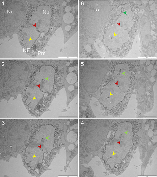 Figure 5: Sig1R is detected in the NR via serial sectioning followed by APEX2-enhanced gold-particle EM. The Sig1R-GFP-APEX2 fusion protein was expressed in Sig1RKO NSC34 cells, followed by cell fixation, serial sectioning, and APEX2-enhanced gold-particle EM, as described in Methods. The sequence of images is indicated by numbers. Each panel shows a transfected cell (middle) and an un-transfected cell (left); this un-transfected internal control showing no Sig1R-indicative dots supports the specificity of the APEX2 gold-particle EM method. The yellow, red, and green arrowheads highlight gradual changes of three NR structures. Note one NR tubular structure eventually connect to the NE (green arrowhead, Image #6). **NE invagination also occurred in un-transfected cells. NE: nuclear envelope; Nu: nucleus; Pm: plasma membrane. Scale bar: 2 μm.