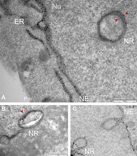 Figure 6: Sig1R localization in the NR membrane cross-sections detected by APEX2-enhanced gold-particle EM. Full-length Sig1R-GFP-APEX2 (in A and B) or Sig1RN80-GFP-APEX2 (C) fusion protein was expressed in Sig1RKO NSC34 cells, followed by cell fixation, sectioning, and APEX2-enhanced gold-particle EM, as described in Methods. Images shown in A-C reveal Sig1R-indicative dots in the membrane of NR cross-sections. Sig1R localization is also shown in the NE membrane. Note the NE invagination in (C) forming a NR structure with an opening toward the cytosol. ER: endoplasmic reticulum; NE: nuclear envelope; Nu: nucleus; Pm: plasma membrane. Scale bar: 0.5 μm.