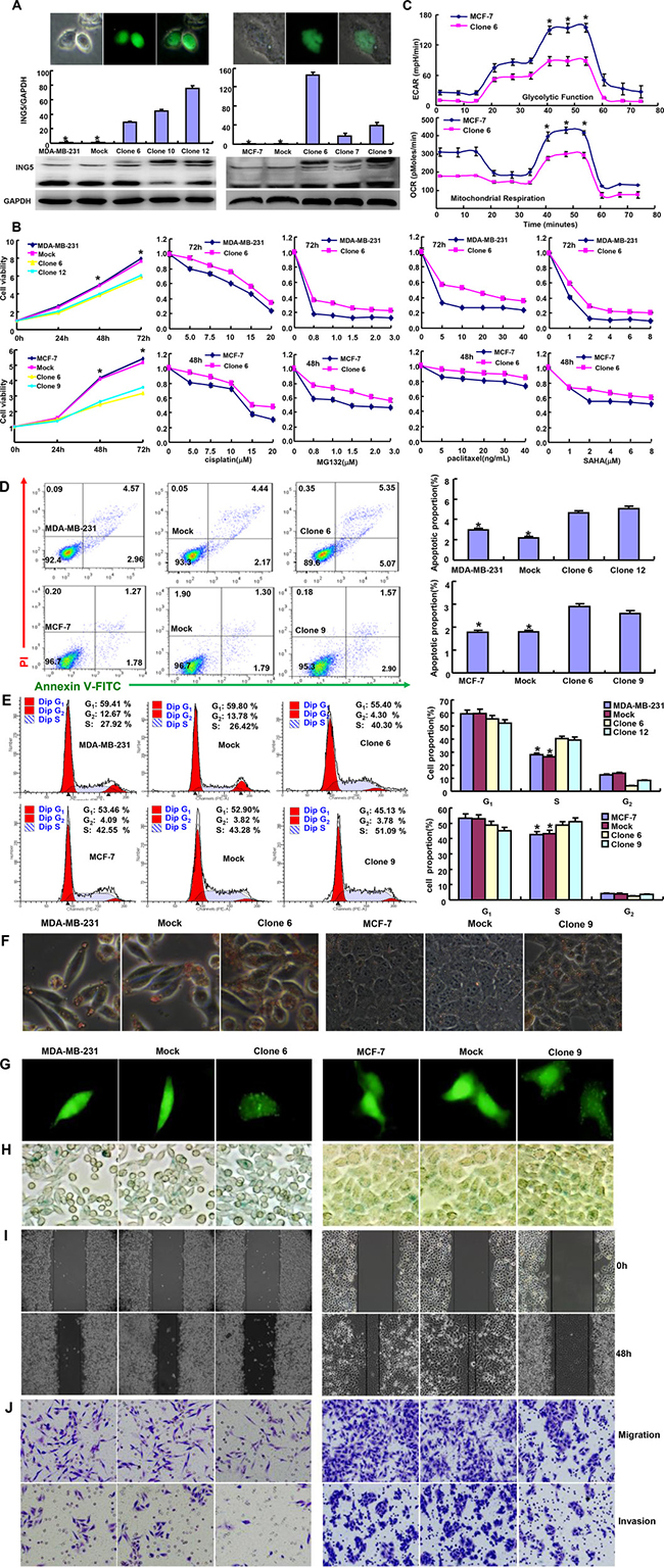 Figure 1: ING5 expression altered the phenotypes of breast cancer cells. After transfection of pCDNA3.1-ING5, its expression became strong in MDA-MB-231 and MCF-7 cells by fluorescence, RT-PCR and Western blot (A). The cell viability was measured using MTT assay in both breast cancer cells and their ING5 transfectants, even treated by cisplatin, MG132, paclitaxel and SAHA (B). The glucose metabolism of MCF-7 and its transfectant was detected by XF-24 extracellular flux analyzers (C). The apoptosis, cell cycle, fat accumulation, autophagy, senescence, migration and invasion were examined by Annexin-V staining (D), PI staining (E), Oil red O staining (F), the transient transfection of LC-3B-expressing plasmid (G), β-galactosidase staining (H), wound healing (I), and transwell chamber assay (J) *p < 0.05, compared with the transfectants.